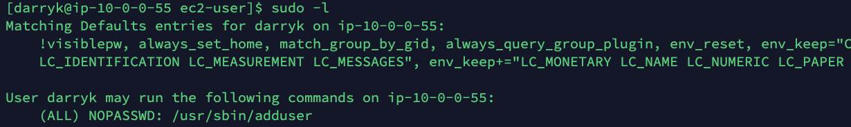 この場合、ユーザはsudoを使ってrootとしてadduserを実行し、新しいローカルユーザを追加することができます。しかし、特定のフラグを使用することで、同じルートユーザIDを持つユーザを作成し、権限をエスカレートさせることができます。