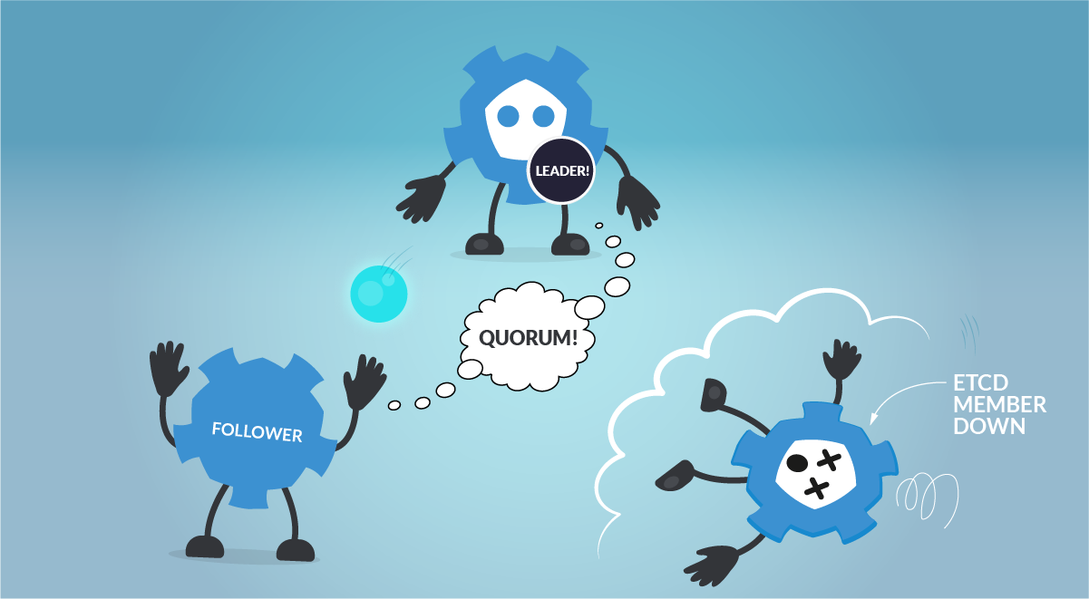 奇数サイズのクラスターは、偶数サイズのクラスターと同じ数の障害を許容しますが、ノード数は少なくなります。さらに、ネットワーク・パーティションが発生した場合、奇数ノードは常に多数派のパーティションが存在することを保証し、恐ろしいスプリットブレイン・シナリオを回避することができます。こうすることで、ネットワーク・パーティションが解消されても、etcdクラスターは稼働し続け、真実の源となることができるのです。