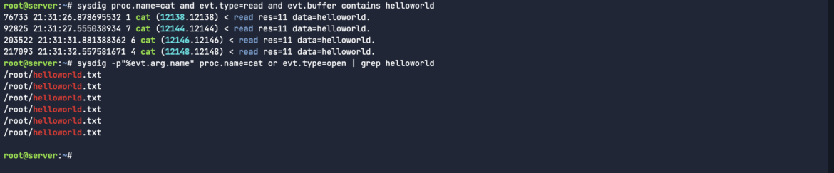 sysdig proc.name=cat and evt.type=read and evt.buffer contains helloworld