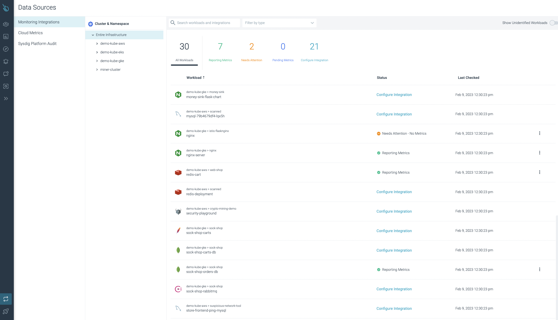 - Sysdig Monitor インテグレーションは、0日目から利用可能です。多くのインテグレーションは既に実装されており、メトリクスを自動的に収集してくれます。その他、シークレットやConfigMapの作成など、追加の手動ステップが必要なものもありますが、ガイド付きウィザードが用意されているので心配は無用です。