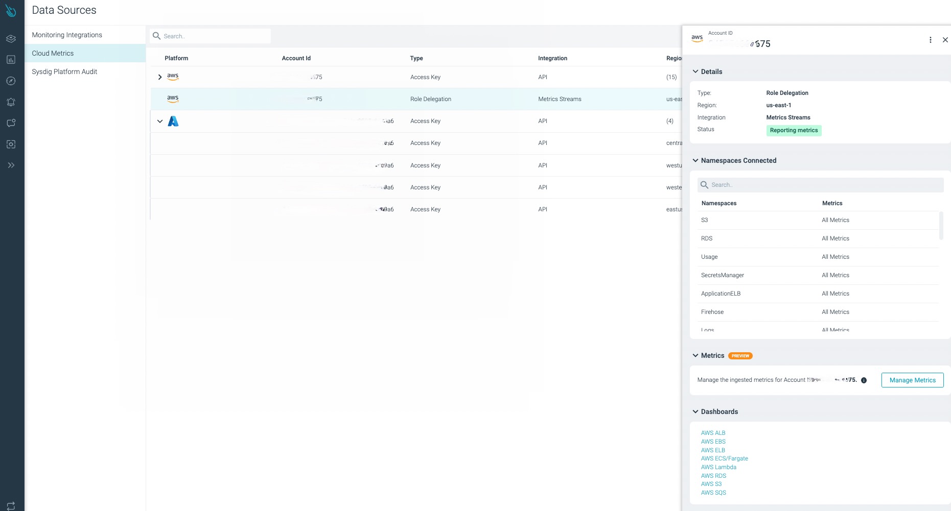 主なクラウドプロバイダー向けのクラウドインテグレーションも利用可能です。Sysdig Monitorとクラウドプロバイダーを接続するだけで、クラウドサービス用のダッシュボードやアラートとともに、多くのクラウドメトリクスを利用できます。