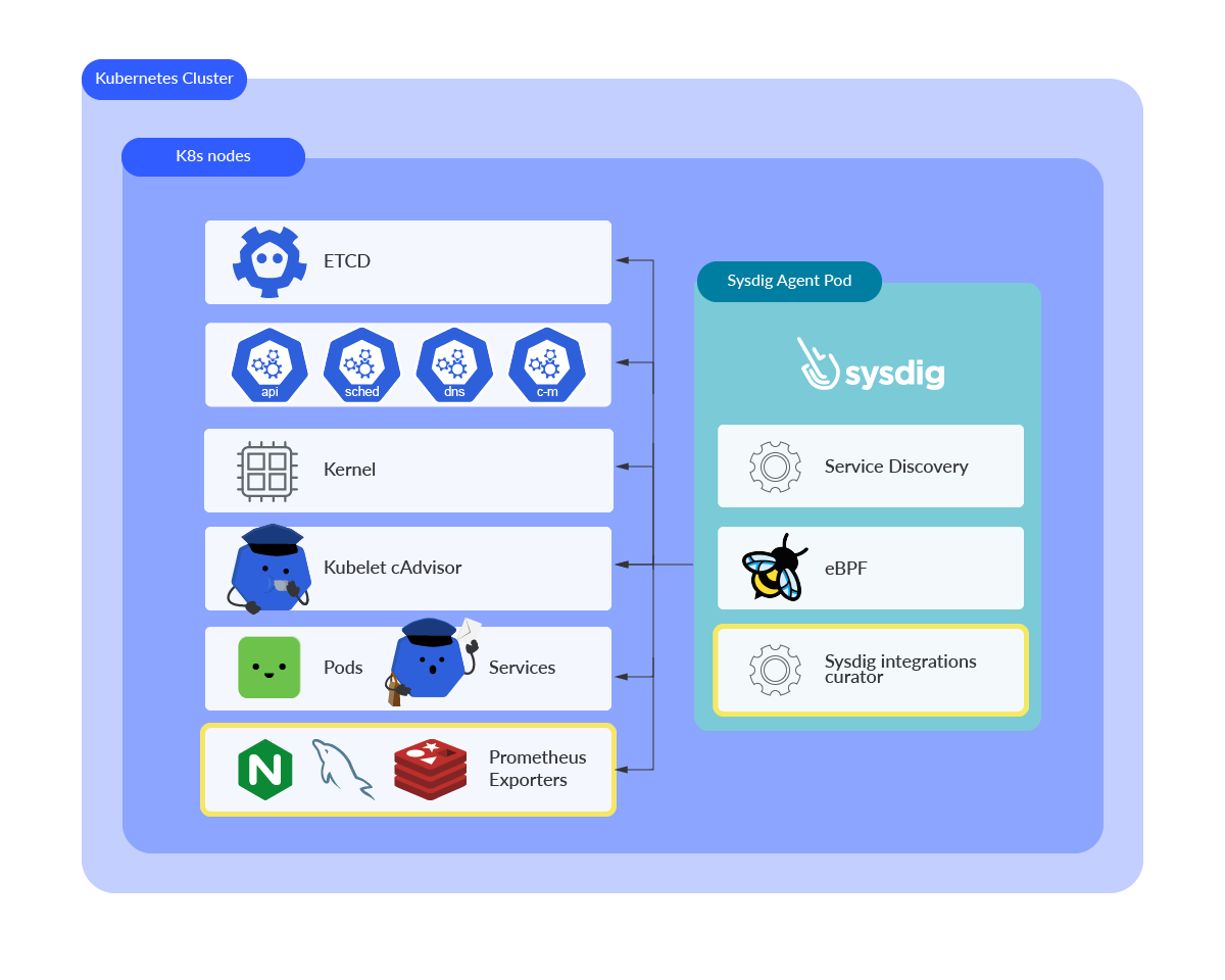 Sysdigは、Kubernetesやクラウド環境からデータを取得し、メトリクスを取得するための独自のエージェントを備えています。Sysdig Agentが舞台裏でどのように動作しているかを詳しく知りたい方は、こちらの記事をご覧ください。メトリクスがどのように取り込まれるのか、またSysdig Agentを使用する利点について、より深く理解することができます。簡単に言うと、Sysdig Agentは軽量のPrometheusインスタンスを組み込んでいます。そうすることで、通常のDIY PrometheusとしてKubernetesやカスタムエンドポイントからメトリクスをスクレイピングすることができるのです。そのため、Kubernetesに独自のPrometheusインスタンスをデプロイしたり、KSMをデプロイしたり、Prometheusノードエクスポーターをデプロイする必要はありません。