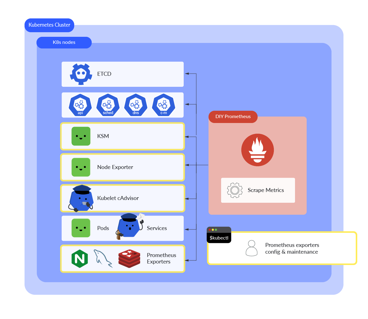- Kubernetesのコントロールプレーンコンポーネントのような重要なエンドポイントは、すでに監視され、最初から利用可能です。エクスポーターをデプロイしたり、Prometheusの設定ファイルを構成したりする必要はありません。