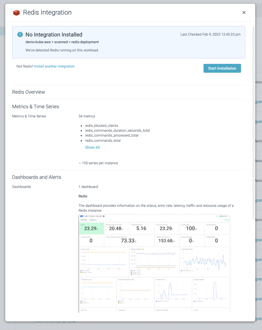 こちらで説明したように、Sysdig MonitorはKubernetesのコンポーネントと独自のサードパーティワークロードの両方を検出します。これは、Kernel insights コレクションのおかげで実現されています。Prometheusインテグレーション・オファリングを確認したい場合は、ドキュメントページをご覧ください。Sysdig Monitorのポータルは、すぐに使えるダッシュボードでメトリクスデータを表示し、そのサービスで利用できる定義済みのアラートのいくつかを有効にするかどうかを選択できるので、これらのインテグレーションの多くは、デフォルトで有効になっています。