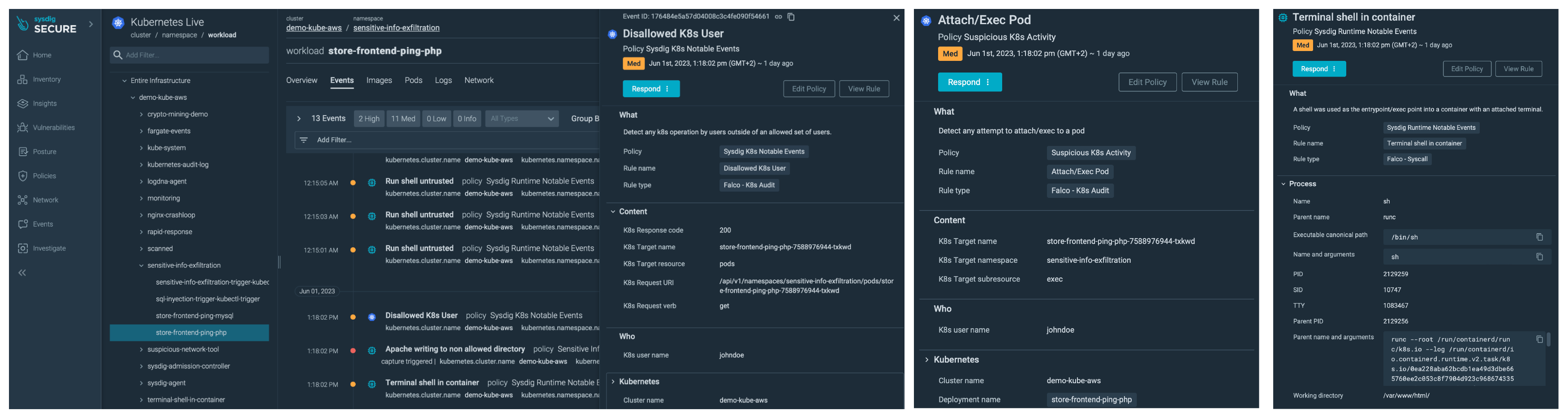 先に述べたように、Sysdig Secureが提供する統合ビューは、さまざまなセキュリティの文脈で価値を発揮します。その能力の高さを示すために、Liveで利用可能な機能をさらに掘り下げてみましょう。