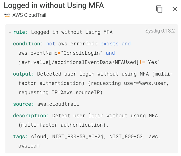 誰かがMFAなしでログインすると、Sysdigはすぐに警告を発します。