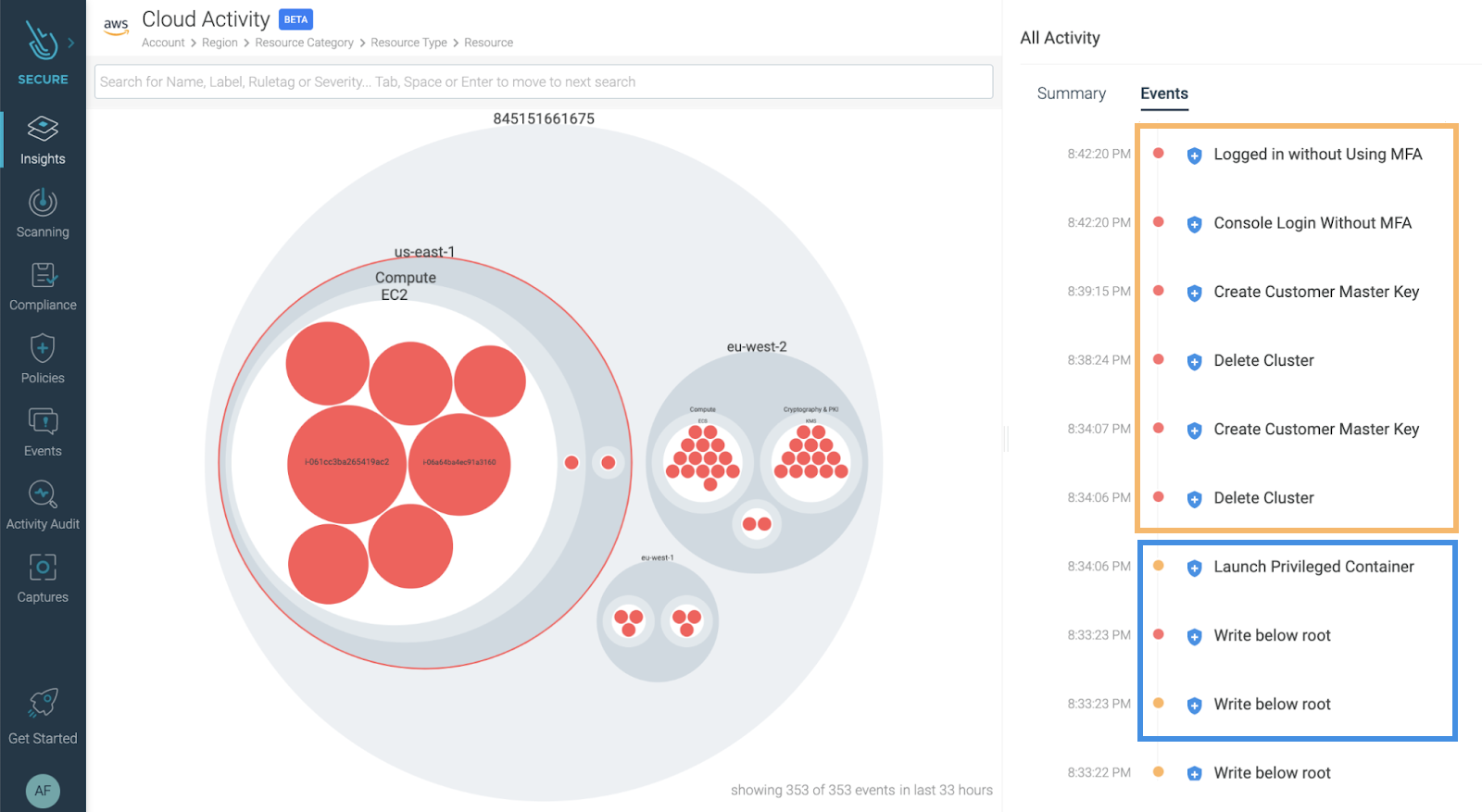 また、Insights Cloud Activityビューでは、ワークロード保護(青枠)とクラウドセキュリティ(オレンジ枠)をつなぐ、セキュリティイベントの完全なタイムラインを見ることができます。