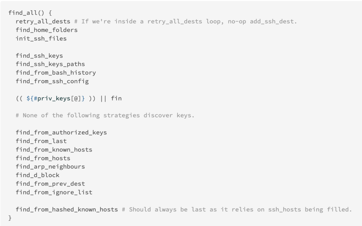 最も興味深い機能の 1 つはfind_from_bash_historyで、ssh、scp、rsyncのコマンドが検索および解析されます。これらのエントリには、秘密キーの場所、資格情報、ターゲットに関する豊富な知識が含まれています。 SSH-Snake がどのように機能するかを完全に説明するには、著者が詳しく説明した記事を書きました。
