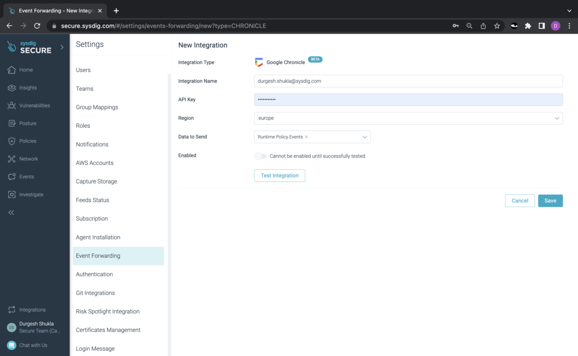 Sysdig Secureの “Settings” > “Event Forwarding” で、“Add Integration.” を選択します。Chronicleを選択します。次に、インテグレーション名とAPIシークレットキーを入力します。また、Google Chronicleに送信するイベントデータの種類として、 “Runtime Policy Events” を選択します。