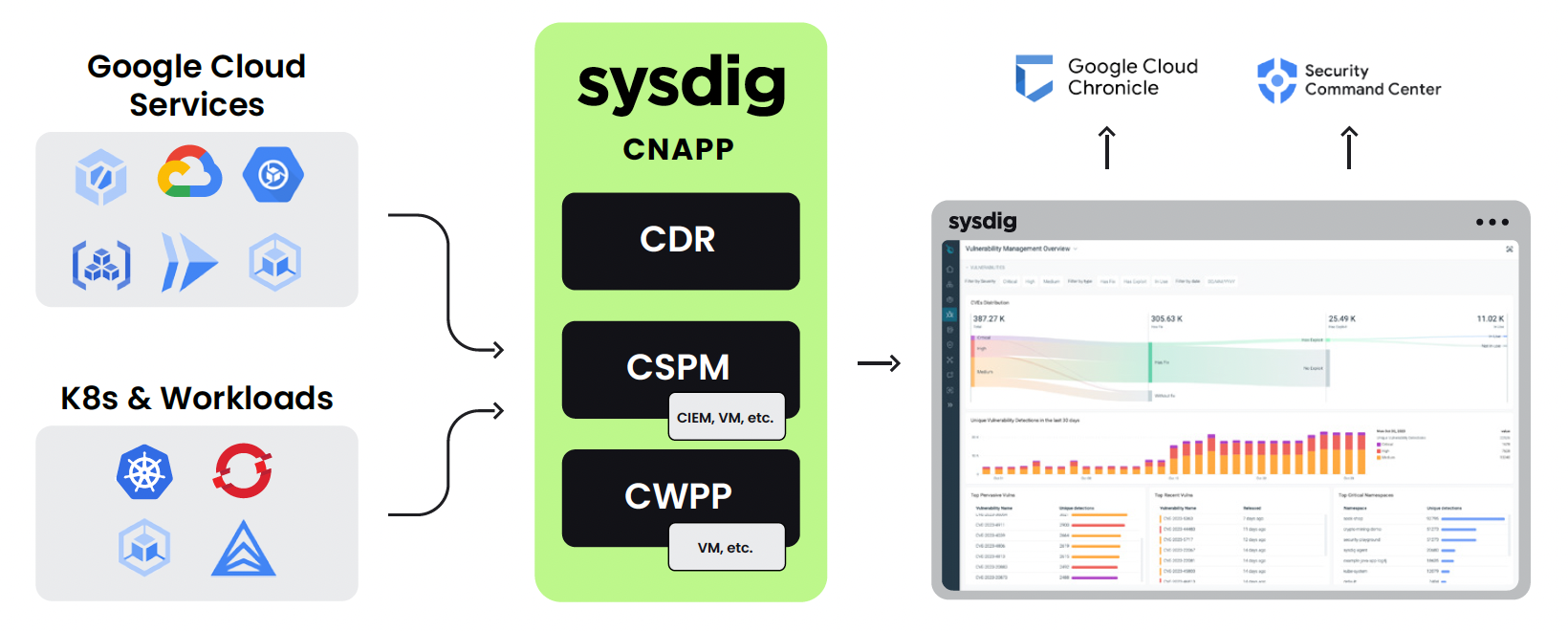 Sysdig のクラウドネイティブ アプリケーション保護プラットフォーム ( CNAPP)は、お客様が Google VM、GKE、Anthos、Google Cloud Run/Build、Google Cloud Registries、Google COS、Google Cloud Artifact Registry を保護するのに役立ちます。