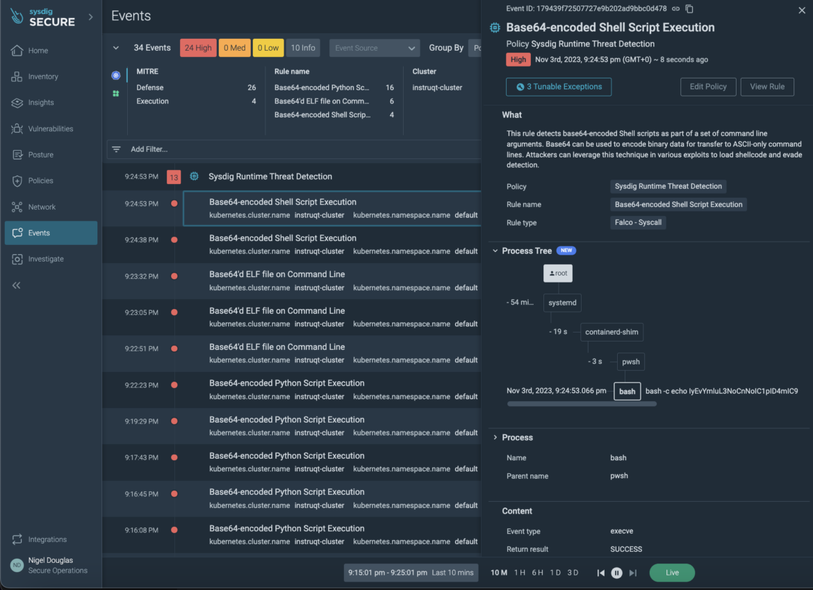 私たちはもちろん、実際のBPFプログラムがカーネルにロードされるタイミングを検出する必要性を示しました。しかし、全体的なサイバー攻撃の準備態勢を改善するためには、このホストエンドポイント攻撃に関連する侵害の指標をすべて検出する必要があります。潜在的に悪意のあるスクリプトがBase64でエンコードされたとき、敵がプログラムを実行する機会を得る前に検出する必要があります。真のランタイム・セキュリティには、悪意のあるペイロードが実行されたときだけでなく、私たちの環境において望ましくない動作について警告することが必要です。Sysdigは、プロセス、コンテナ、ホスト、Kubernetes、クラウド間のコンテキストを相関させることで、エンコードされたスクリプトがどこから実行されたかを正確に伝え、対応までの時間を改善します。