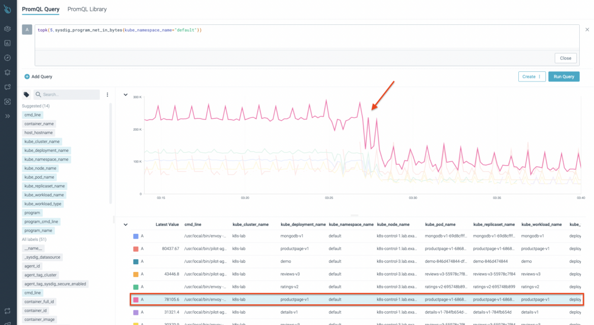 次に、 sysdig_program_net_in_bytes メトリクスを使用します。このメトリクスは、特定のコンテナの実行中のプロセス詳細である cmd_lineのような、さらなる情報を提供します。次の図では、一番上の結果が productpage-v1ワークロードに属し、より具体的にはenvoyプロセスであることがわかります。