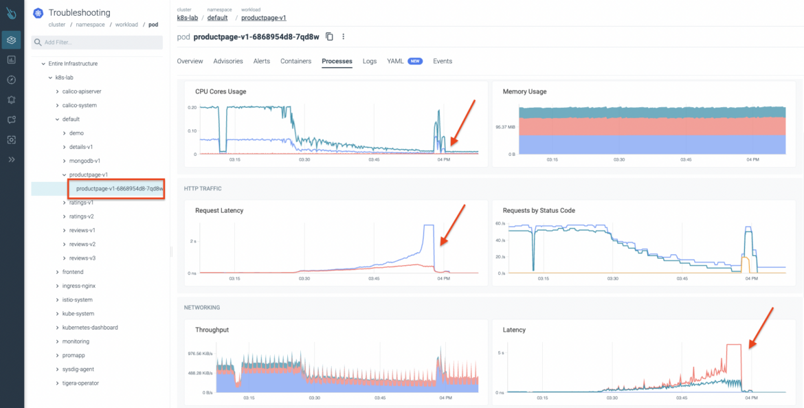 Sysdig Advisorのコンソールで異常な動作が検出されました。次の画像でわかるように、レイテンシーが急上昇しています。アプリケーションの1つが何らかの問題に直面しているようで、レイテンシーが突然増加し始めたのです!😱