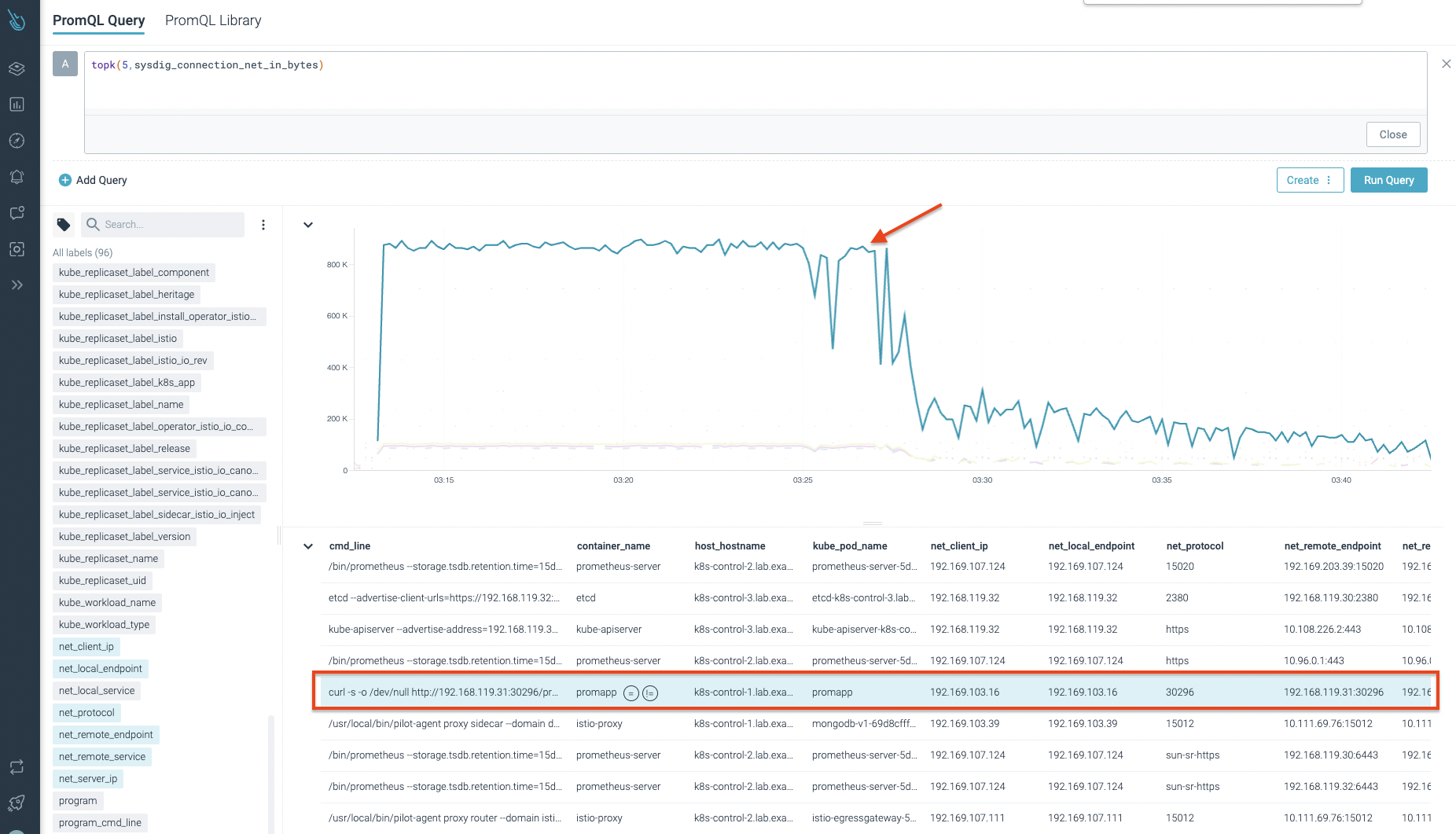 このようなネットワーク問題の犯人を見つける必要があります。そのために、より一般的なメトリクスであるsysdig_connection_net_in_bytes を使用します。そうすることで、より広い範囲をチェックすることができます。イベントを関連付けるために必要な拡張ラベル( cmd_line, net_client_ip, net_local_endpoint, net_protocol, and net_remote_endpointなど)を賢く選択する必要がある。