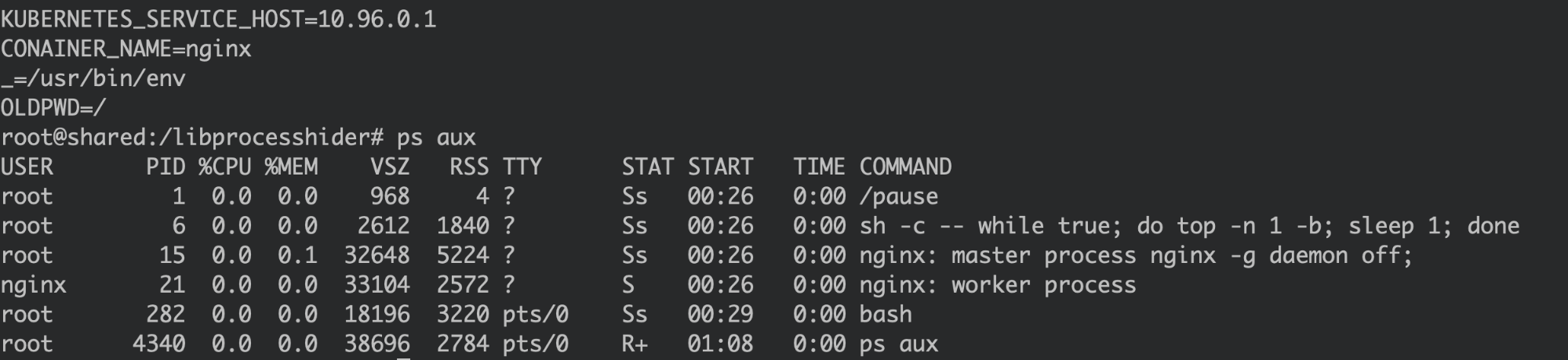 ここで、攻撃者がnginx Podにアクセスし、悪意のあるプロセスを隠したとします。