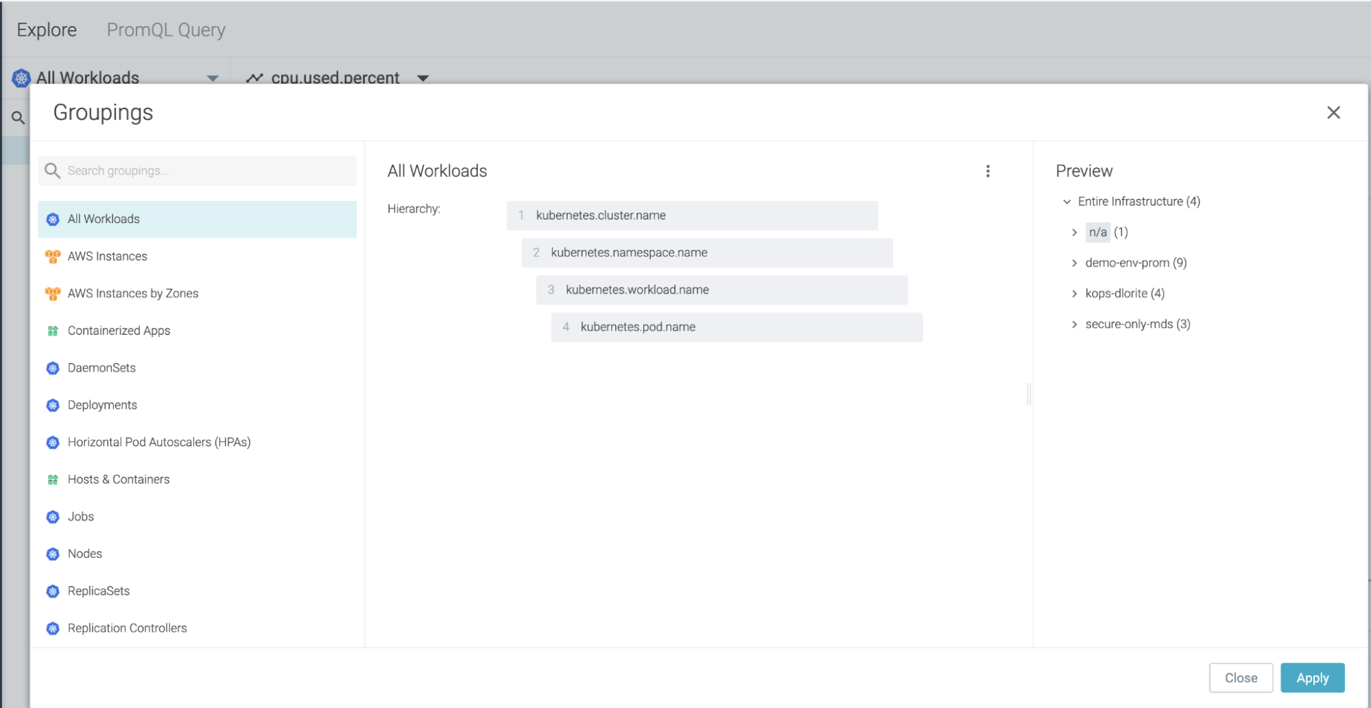 Sysdig Monitorは、kubernetes.workload.nameとkubernetes.workload.typeという2つの新しいラベルをサポートしており、ダッシュボードのスコープやグルーピングの設定に使用できます。
