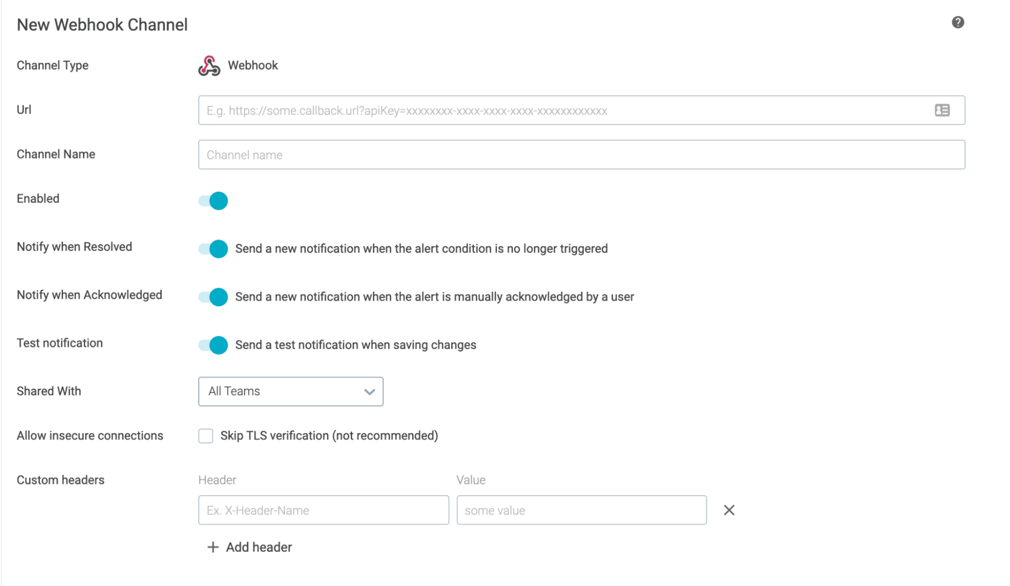 - Custom headers:Webhook統合で追加のヘッダやデータが必要な場合、UIでカスタムヘッダを使用してアラートフォーマットに追加することができます。このオプションは、カスタムヘッダーをプログラム的に追加する既存のAPI機能に加えて使用します。