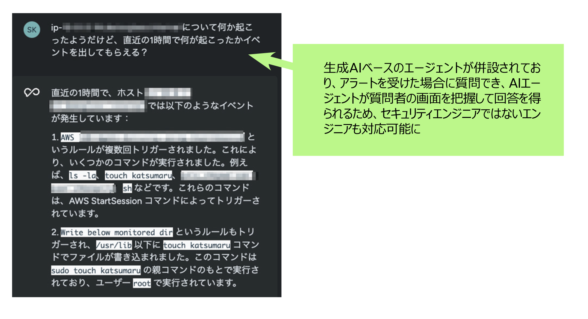 勝丸氏はSysdigの良さについてコンプライアンスの違反を数値で表示でき、その修正方法についても提案してくれる機能について「コンプライアンスに関するアラートが出力されても原因は何か、何を直せばいいのかまで提案してくれるのは本当に助かります。今後はクラウド基盤チームからセキュリティをデベロッパーにシフトレフトしたいと考えていますが、セキュリティやコンプライア ンスにあまり詳しくないデベロッパーにも役立つ機能だと思います」と語り、Sysdig Sageが提供するAIを用いたセキュリティアナリ ストの機能を高く評価しています。
