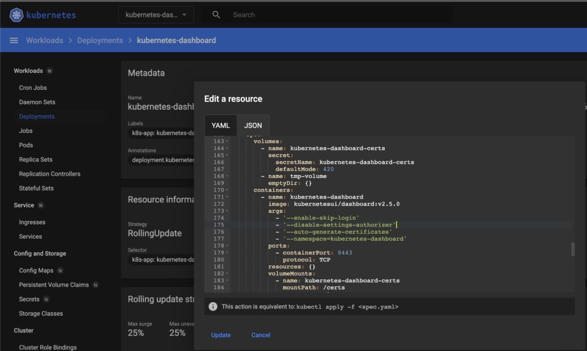 特定の引数を使用してkubernetes-dashboardアプリケーションを再デプロイすることで、skip-login を有効にすることもできます。これはダッシュボードで実行できます。このネームスペースでkubernetes-dashboardデプロイを見つけ、次に示すようにリソース定義を編集します。
