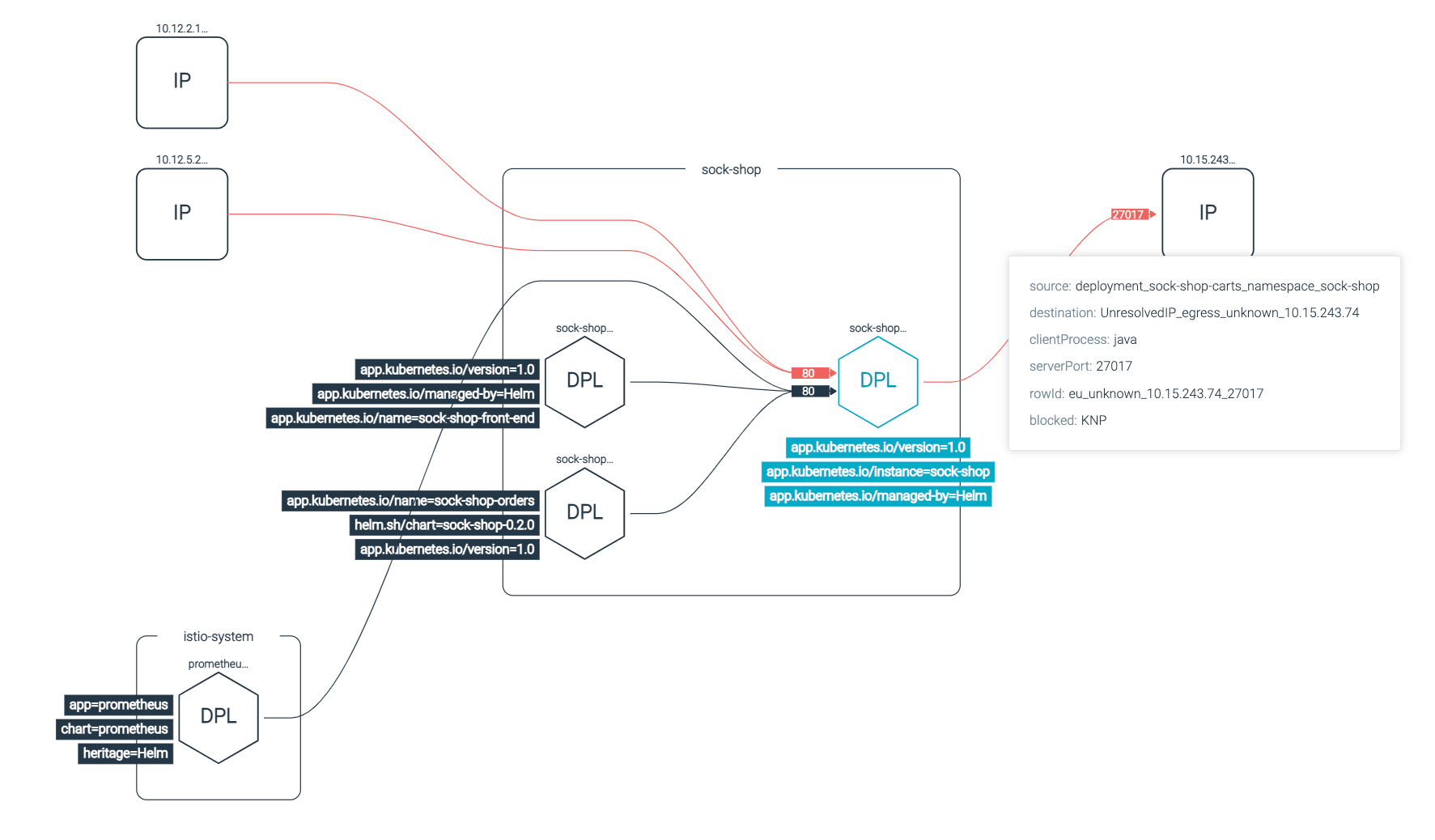 See all network activity in and out of a particular pod, service, or application. Investigate suspicious traffic and connection attempts.
